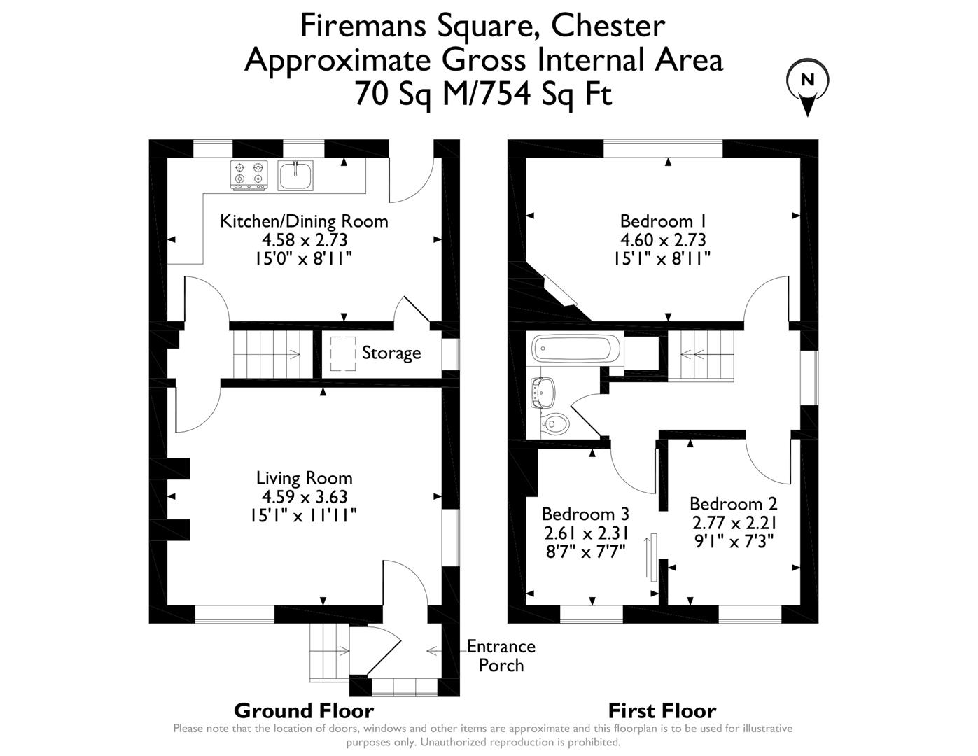 The property is elevated from the street, showcasing a welcoming entrance porch. Inside, a versatile living room enjoys dual-aspect windows and an electric fire creating a cozy focal point. The well-proportioned kitchen offers ample storage and work surfaces. A practical understairs cupboard provides additional storage and space for a tumble dryer. The rear door opens directly to the courtyard. Upstairs, there is a spacious landing, three bedrooms and a bathroom. The principal bedroom features a charming original wrought iron fireplace. Bedrooms two and three have a connecting door, offering flexibility as guest rooms, home office, or dressing area. A boarded loft provides additional storage. The bathroom is finished with white tiling and features a full-sized bath with overhead shower, integrated vanity unit, fitted shelving and a heated towel rail.