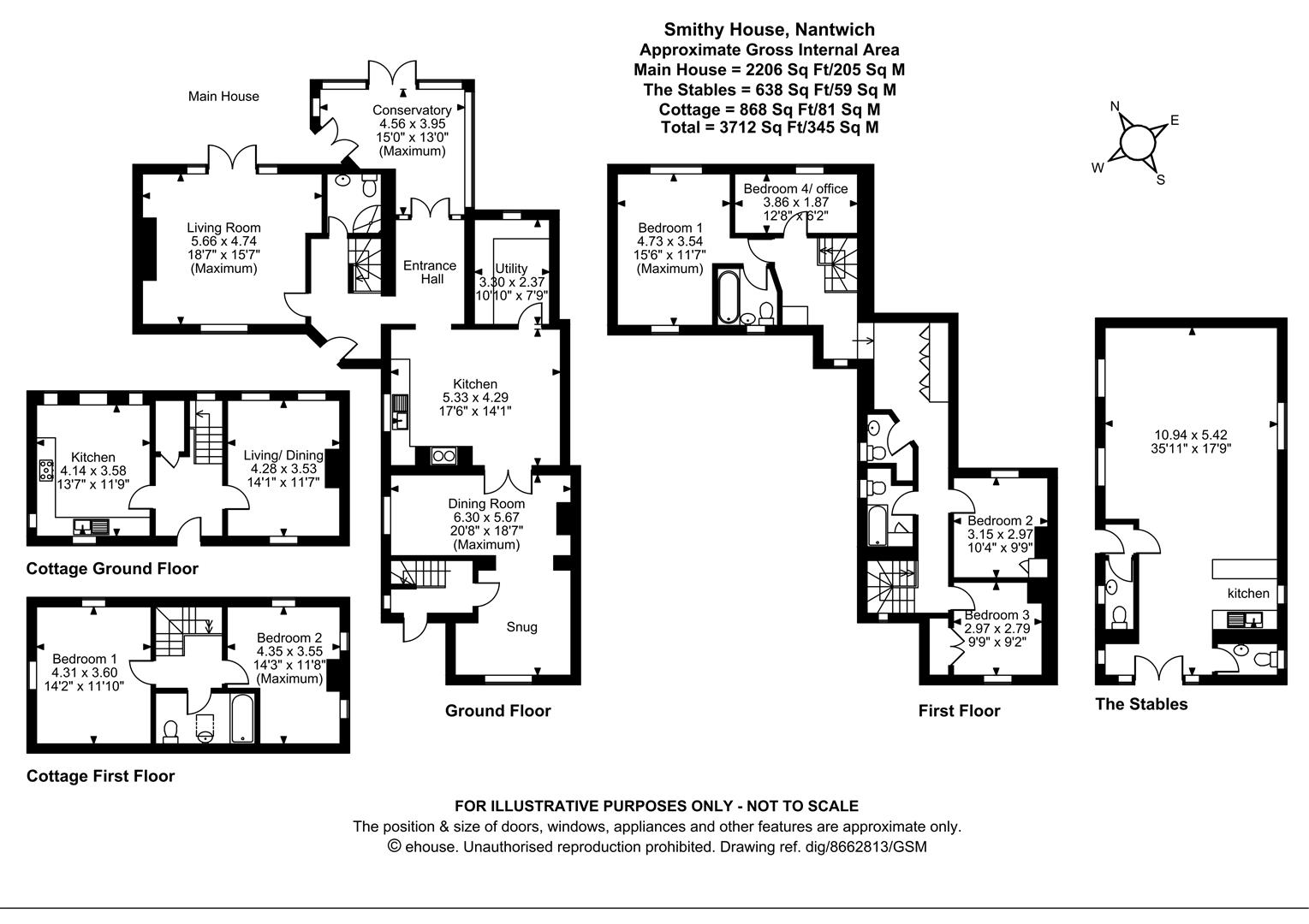 Smithy House offers spacious and characterful accommodation across two floors. The ground floor features four reception rooms, including a welcoming entrance hall, a shower room with WC, a cosy living room with a feature brick fireplace and wood-burning stove and a conservatory with views to the rear gardens.