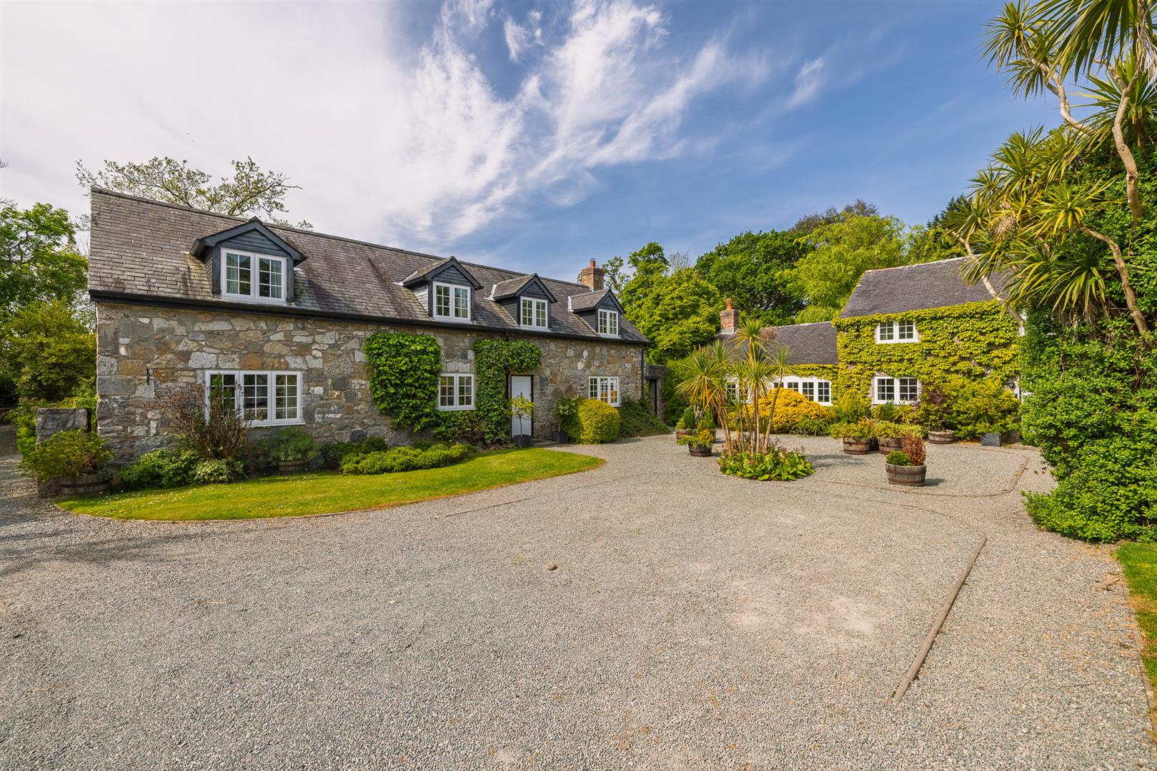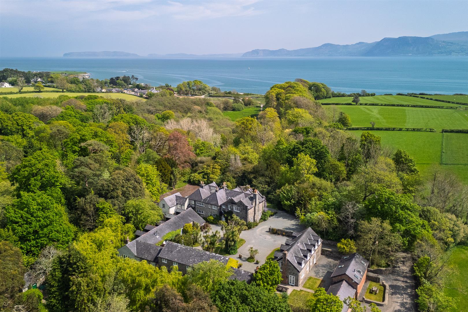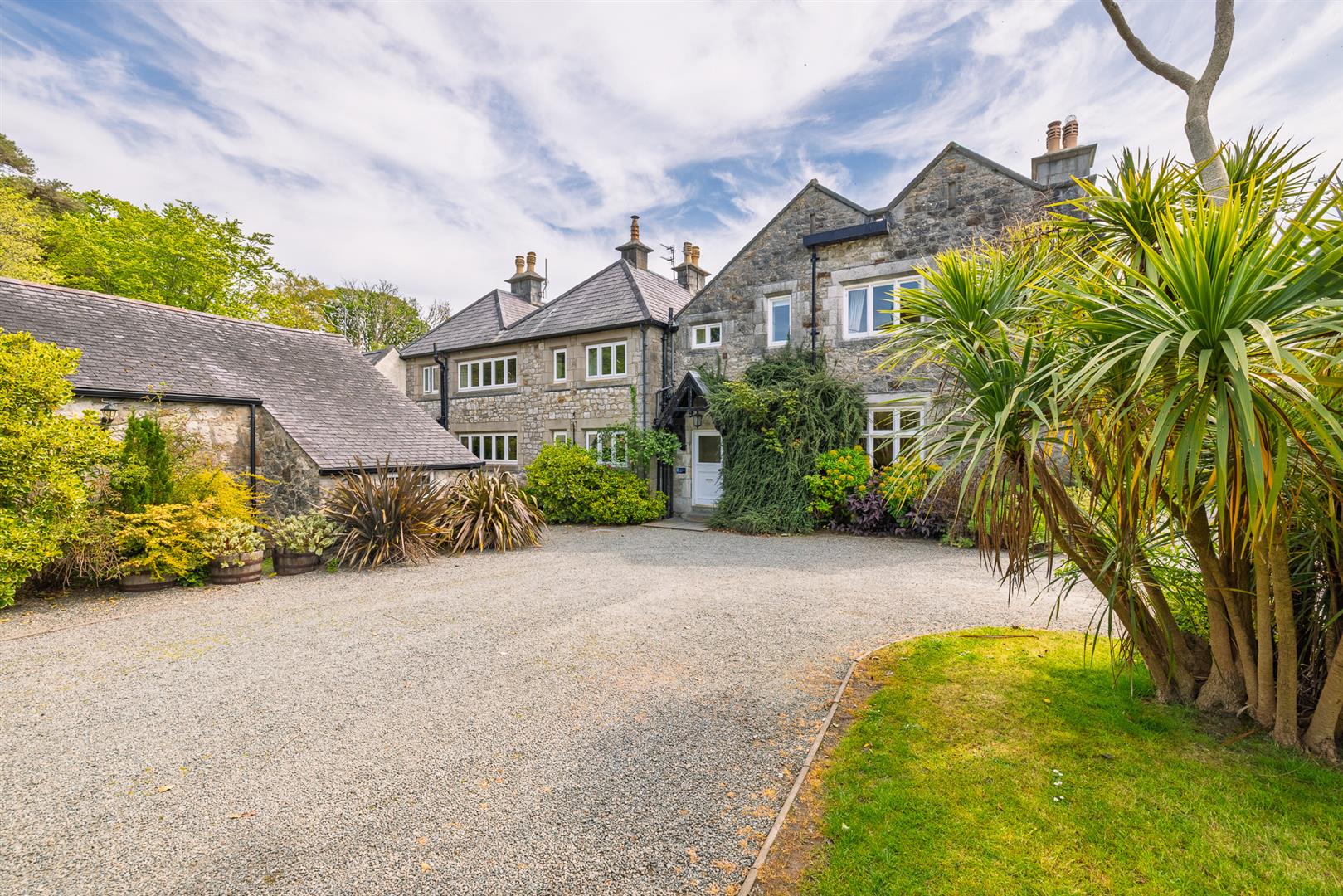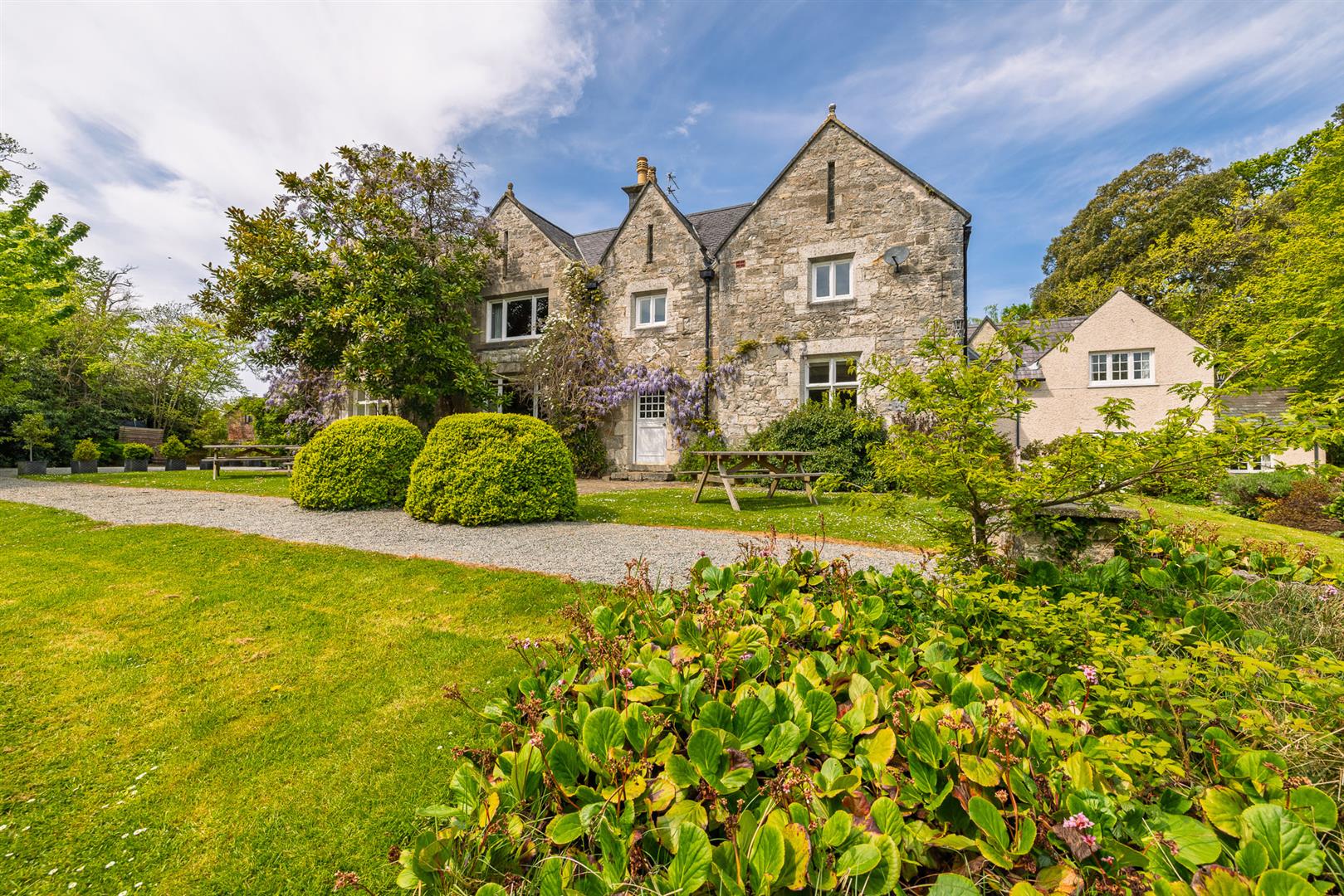 The grounds provide a sanctuary of peace and privacy, encompassing eight acres of gardens and mature woodland interwoven with winding paths and open lawns. Elevated vantage points reveal far-reaching views across lush countryside to the sparkling waters of the Menai Strait, framed by the dramatic peaks of Snowdonia.