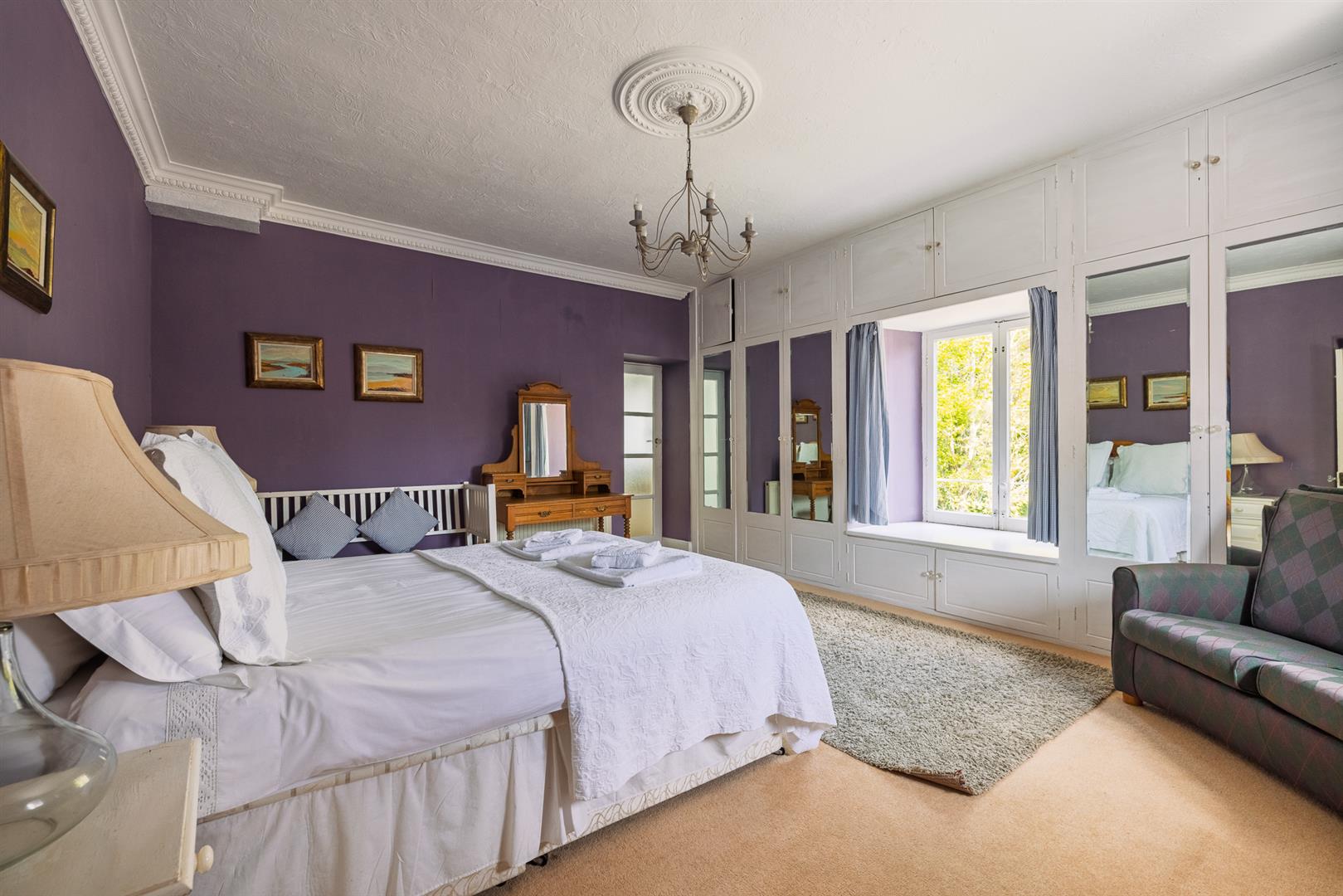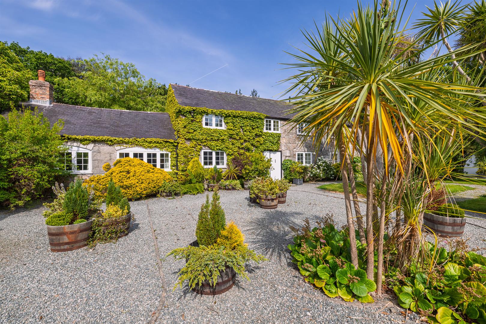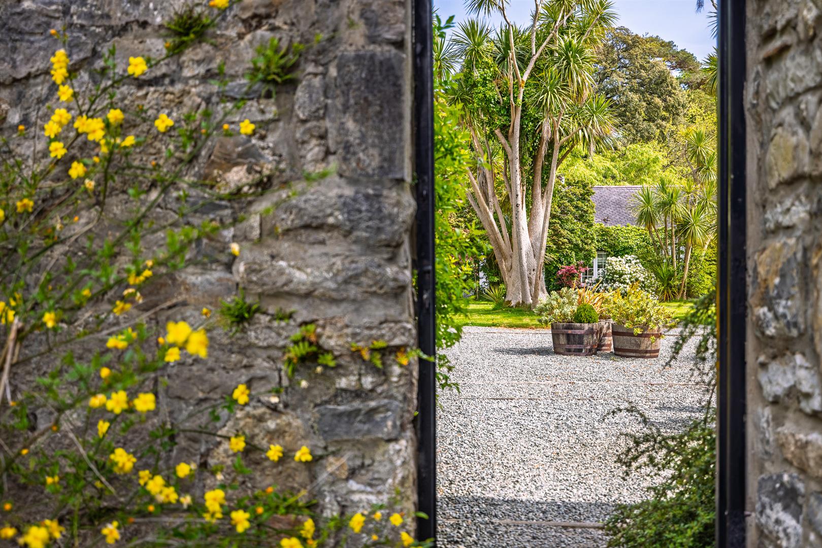 The grounds provide a sanctuary of peace and privacy, encompassing eight acres of gardens and mature woodland interwoven with winding paths and open lawns. Elevated vantage points reveal far-reaching views across lush countryside to the sparkling waters of the Menai Strait, framed by the dramatic peaks of Snowdonia.