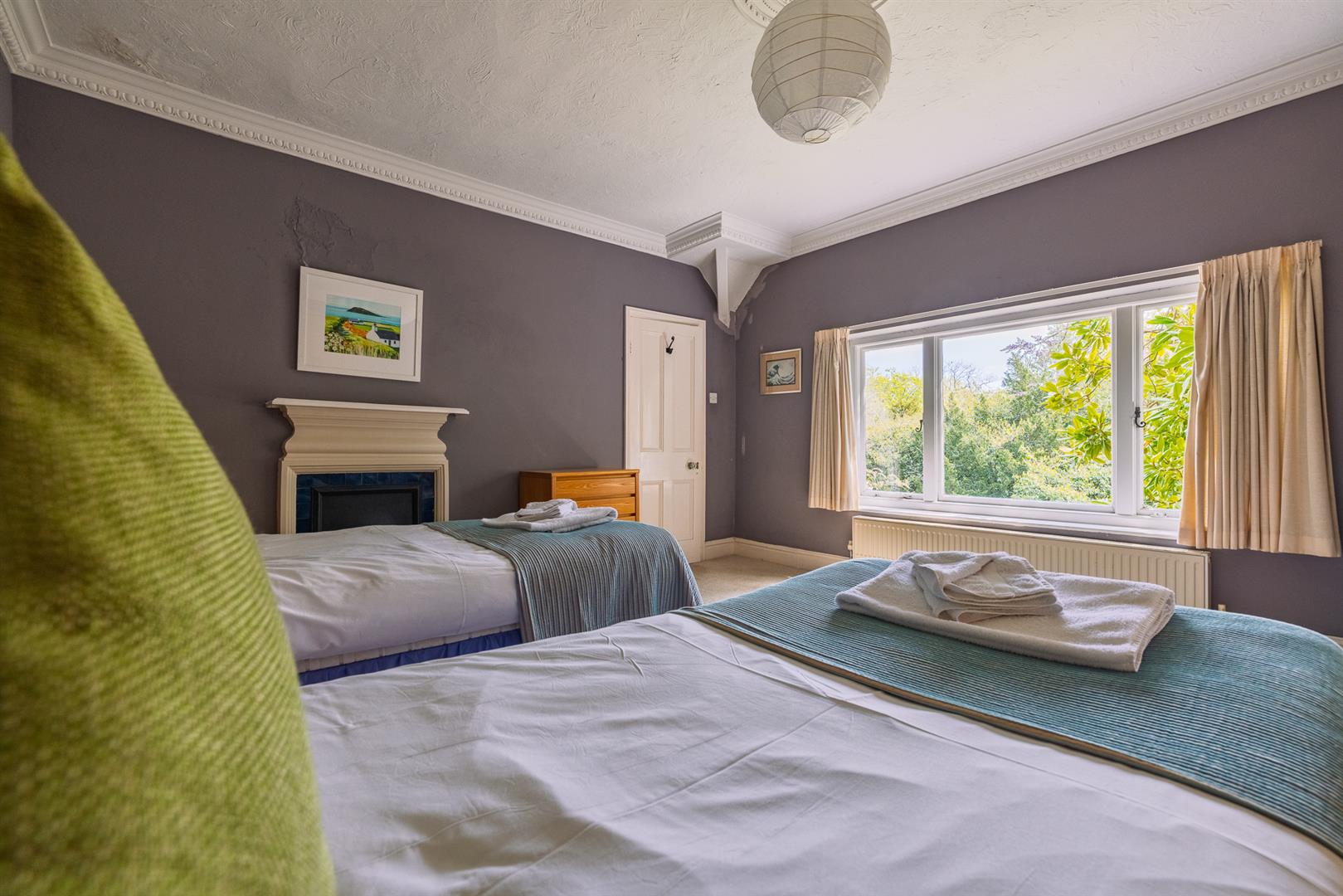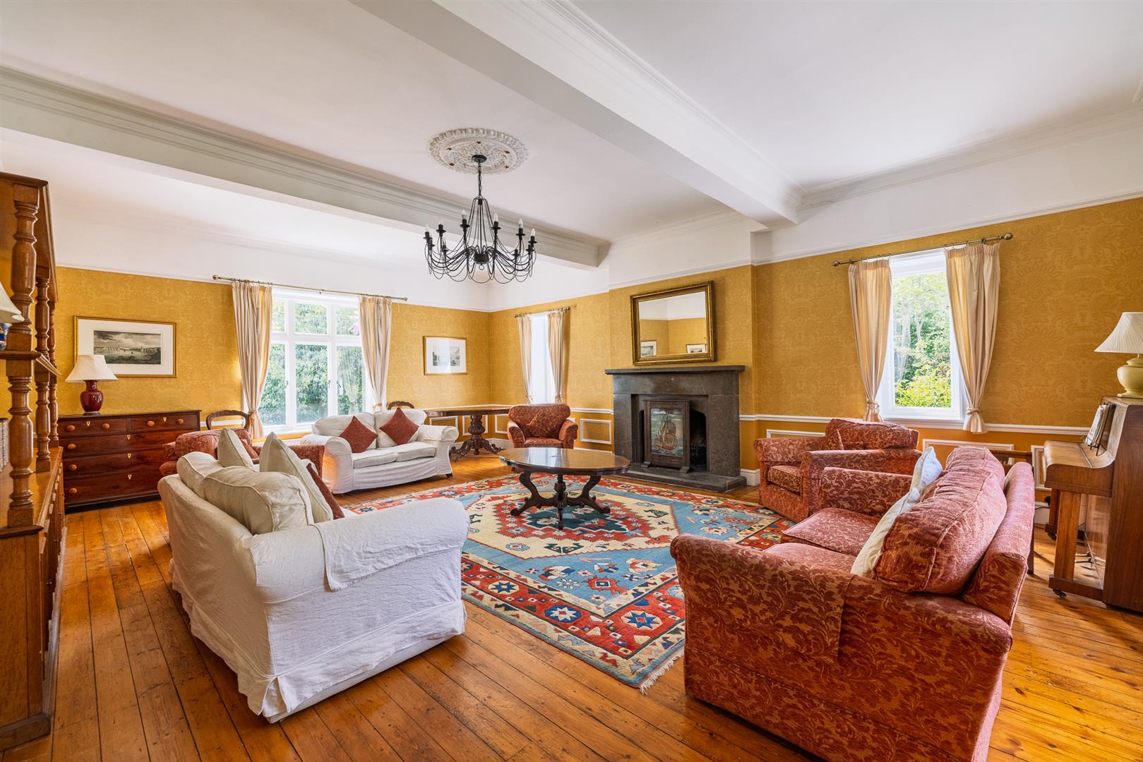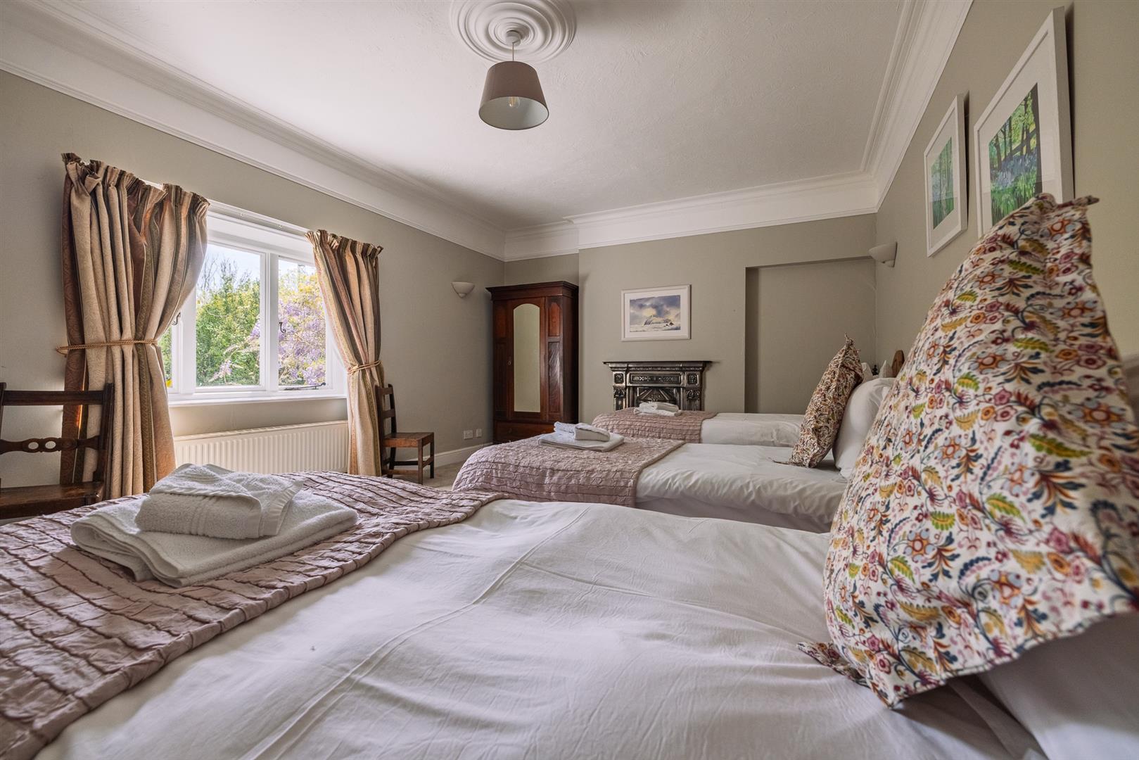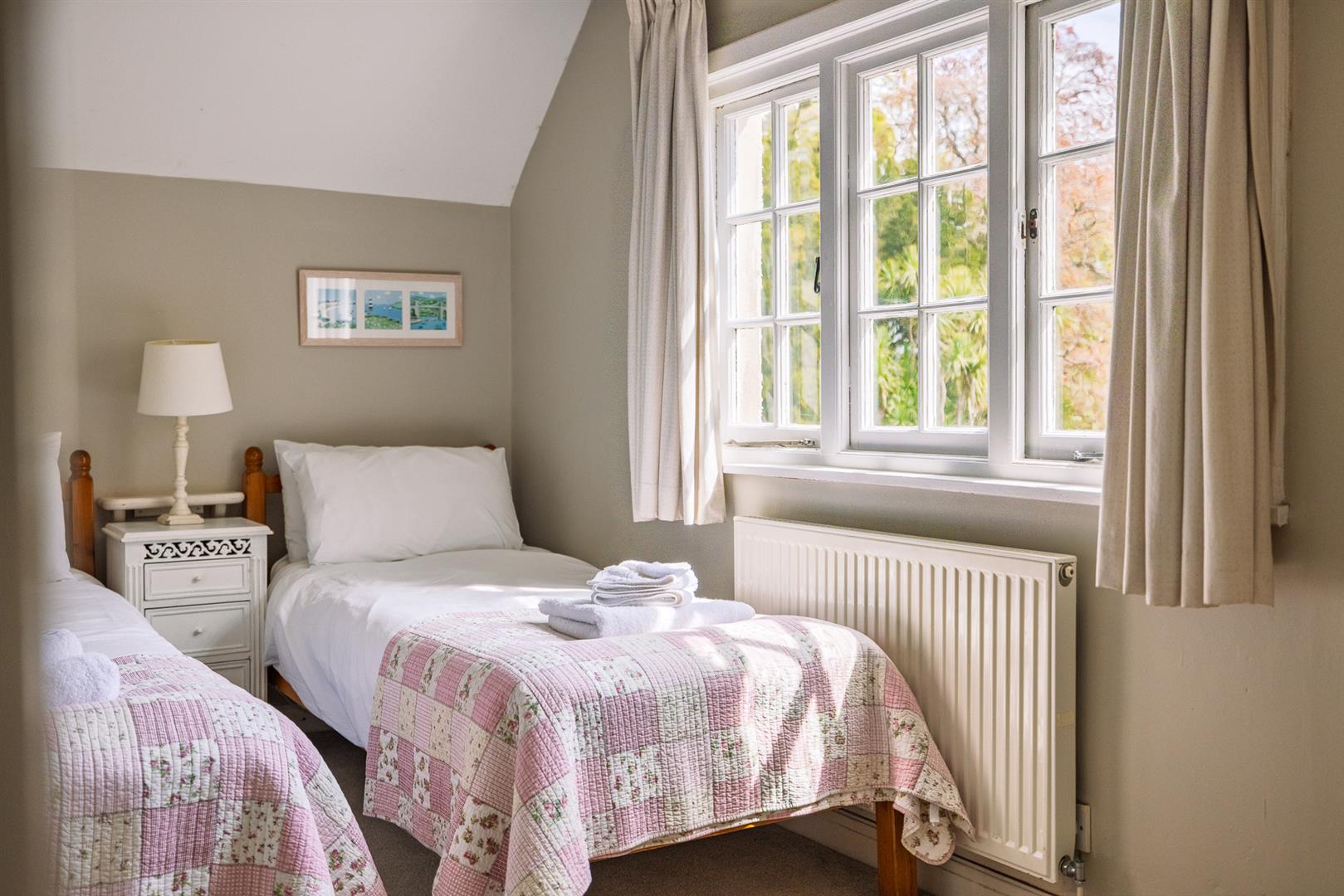 The grounds provide a sanctuary of peace and privacy, encompassing eight acres of gardens and mature woodland interwoven with winding paths and open lawns. Elevated vantage points reveal far-reaching views across lush countryside to the sparkling waters of the Menai Strait, framed by the dramatic peaks of Snowdonia.