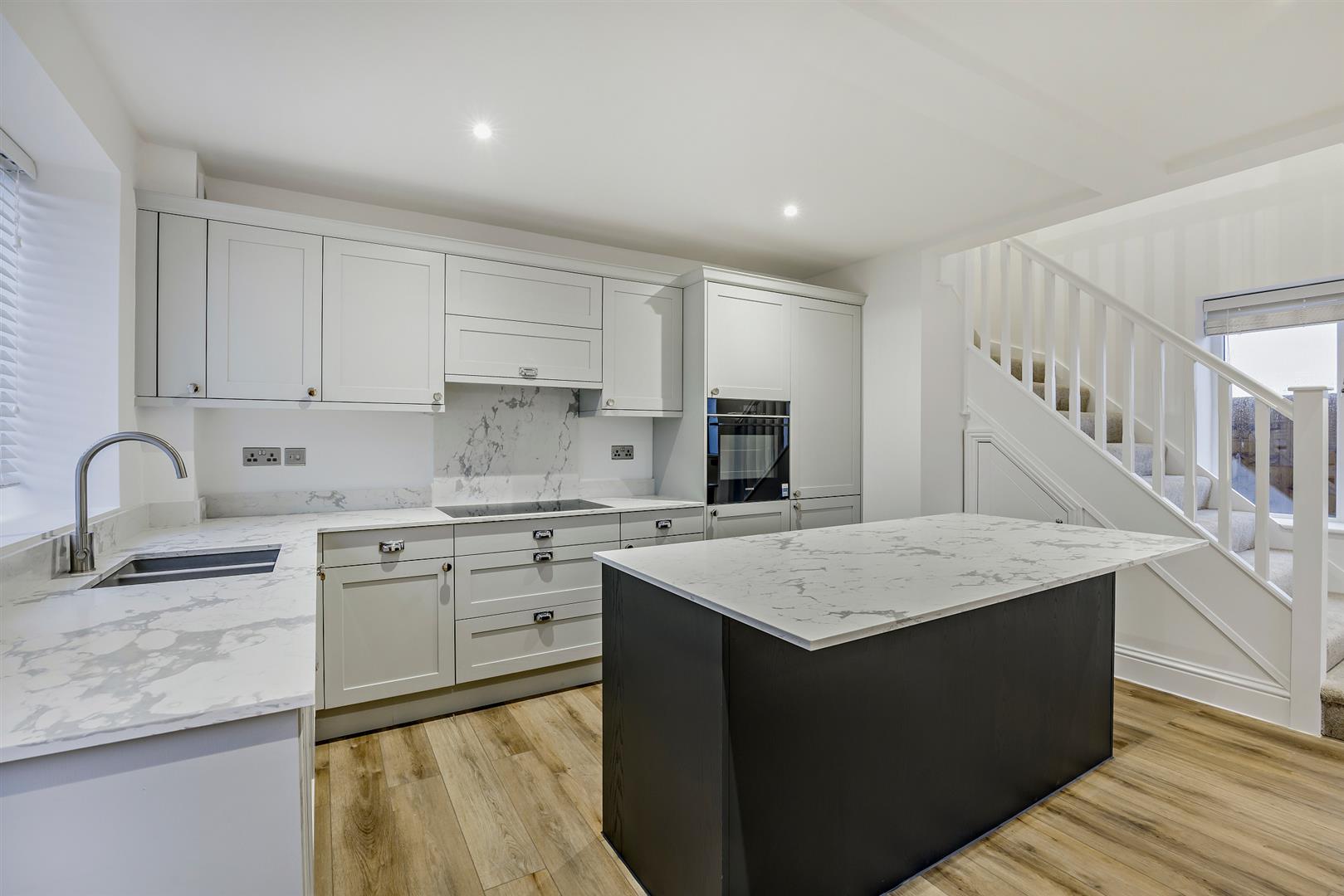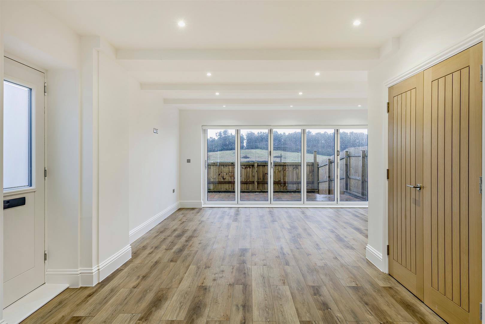 On the ground floor, the property offers a spacious and versatile open-plan kitchen and living area, enhanced by elegant wood-effect flooring and full-width bi-folding doors that open out onto the patio and garden—perfect for indoor-outdoor living. The kitchen is fitted with quartz stone worktops and high-quality Siemens integrated appliances, including a fridge, freezer, dishwasher, oven, 5-ring hob and extractor fan. A separate utility cupboard provides space for laundry appliances, and there is also a downstairs WC and useful understairs storage.