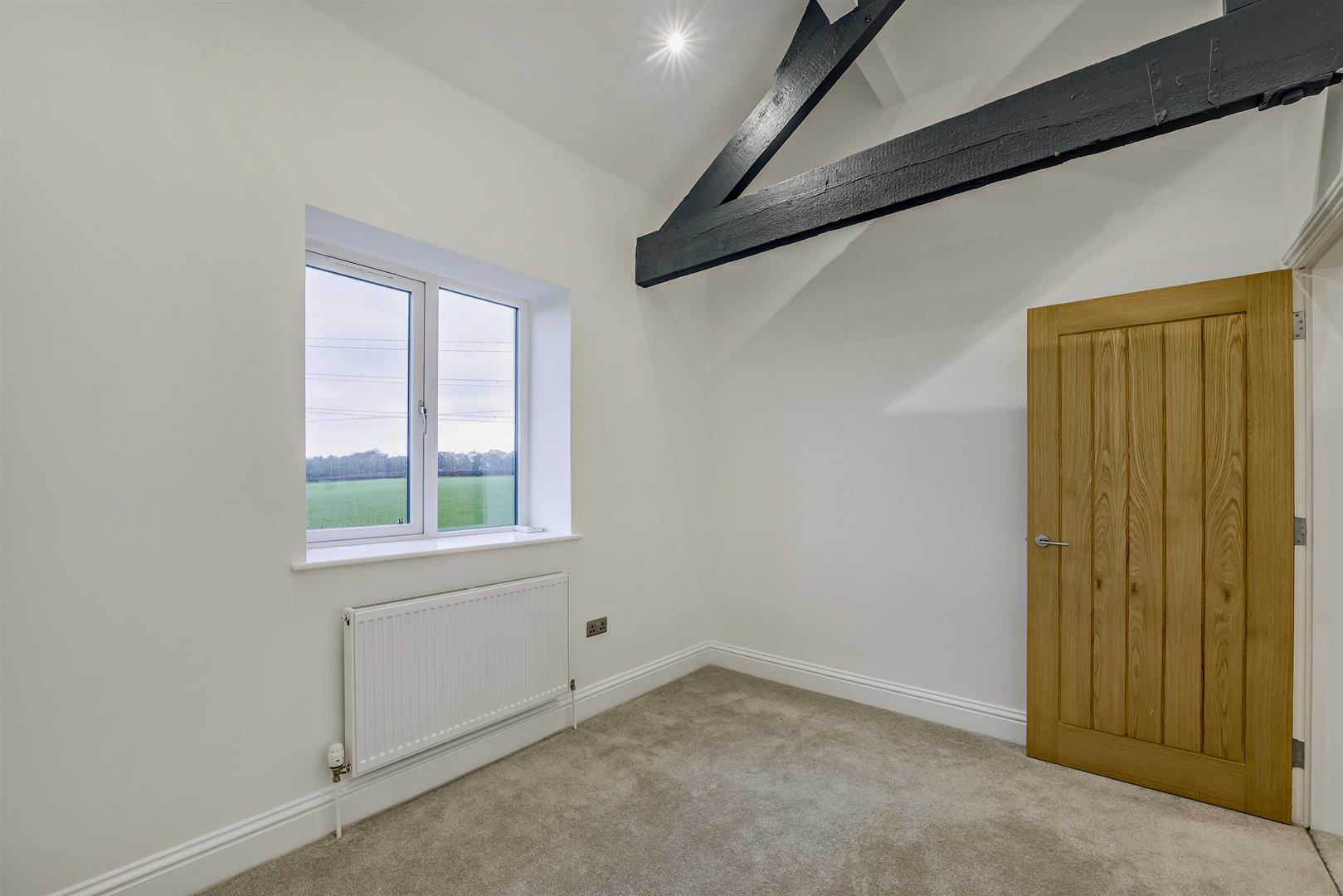 A standout feature of the home is the principal bedroom, where full-height windows span the width of the room, opening via sliding doors to a Juliet balcony with far reaching panoramic countryside views. This room also benefits from a stylish en suite shower room. The second bedroom showcases attractive character beams, while the third bedroom is ideal as a home office or nursery. The fully tiled family bathroom includes a WC, washbasin and bath with dual shower over.